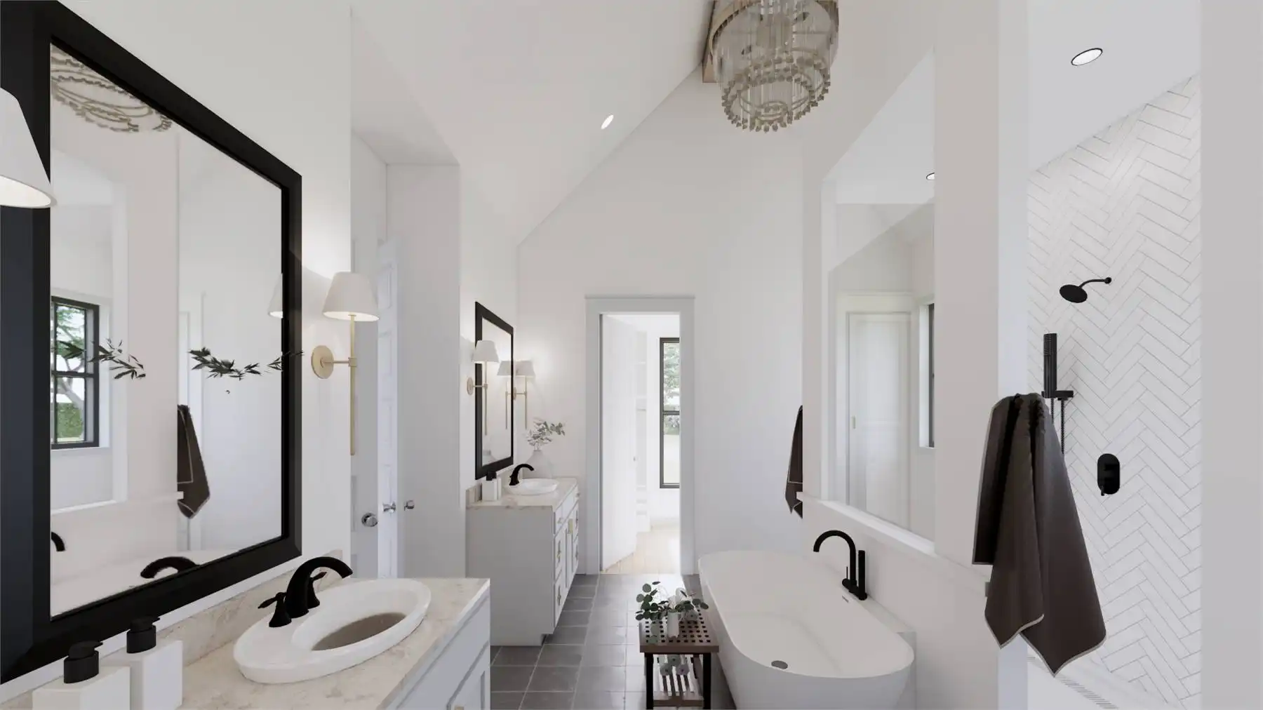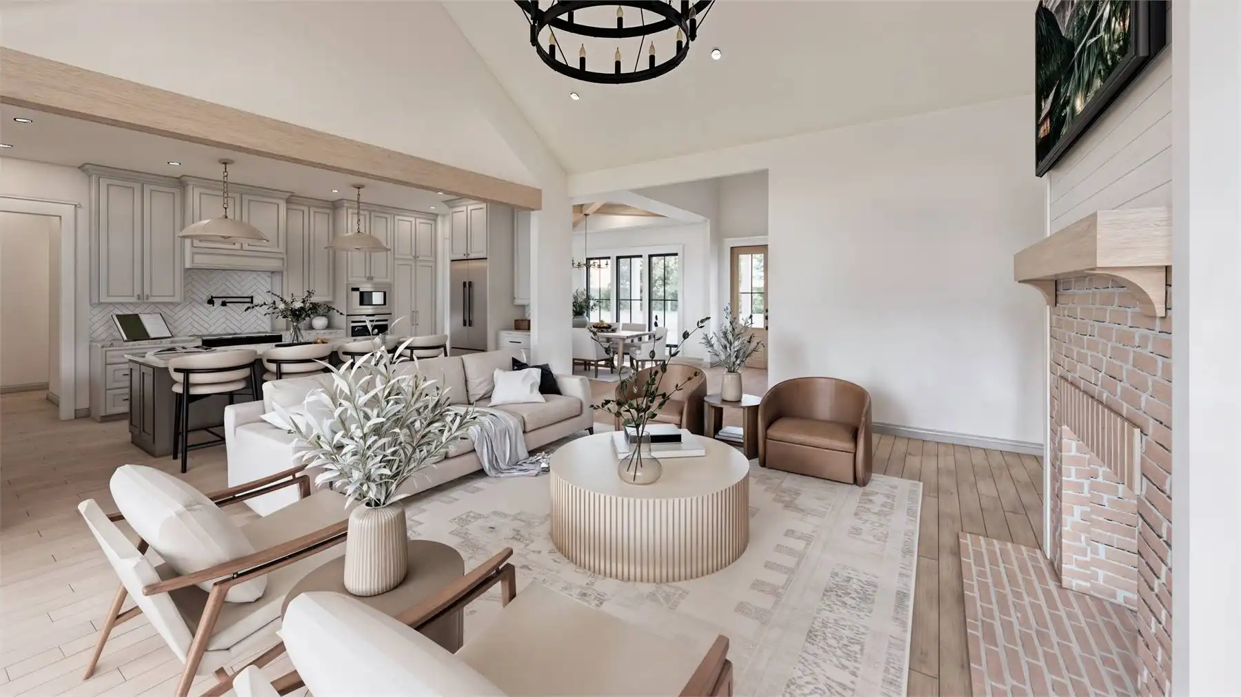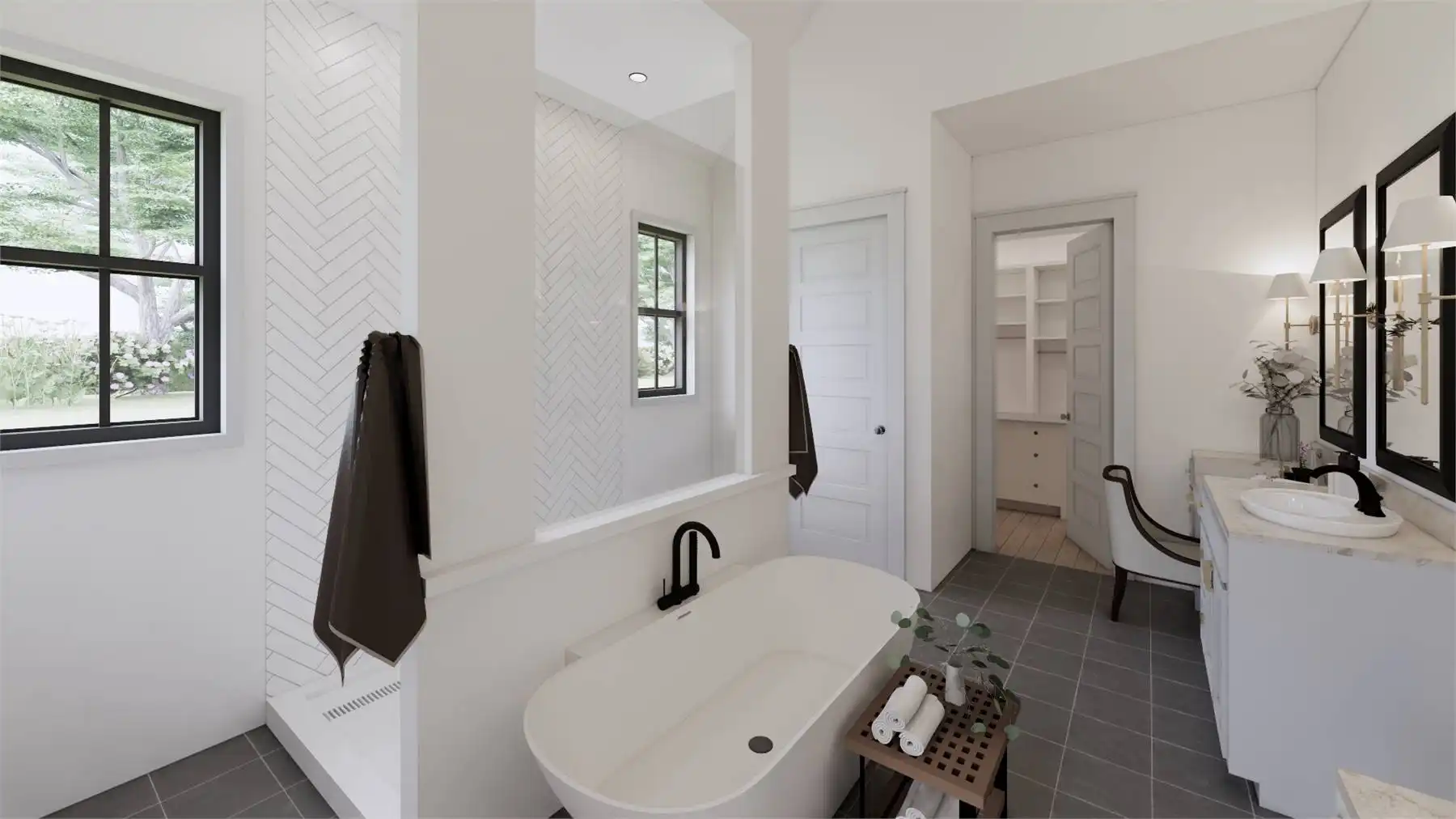 House Plan 9752 is a beautiful one-story Modern Farmhouse offering 3,292 square feet of living space, with 4 bedrooms, 3.5 bathrooms, and a home office. The exterior features exposed rafter tails, a metal roof, stone accents, and board and batten siding for a timeless look. Inside, the open layout is perfect for family living, and the optional bonus room offers extra space with the potential for an additional half bath.