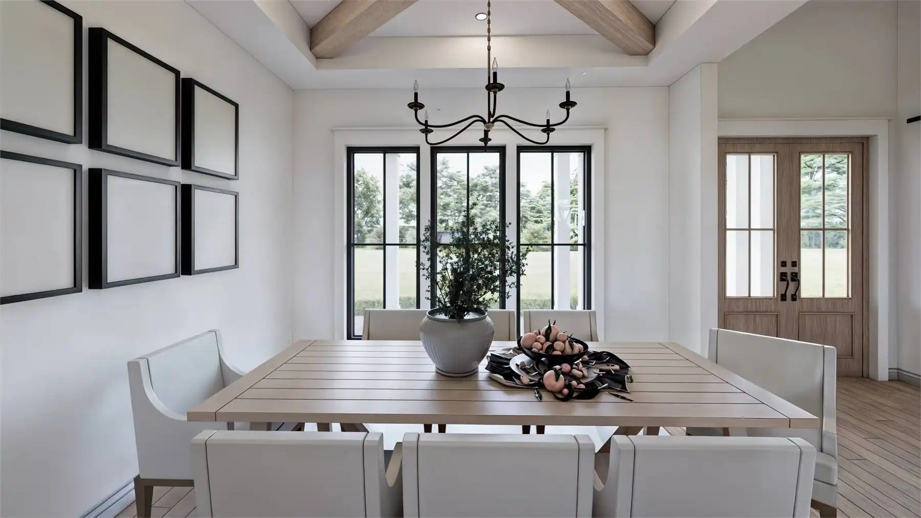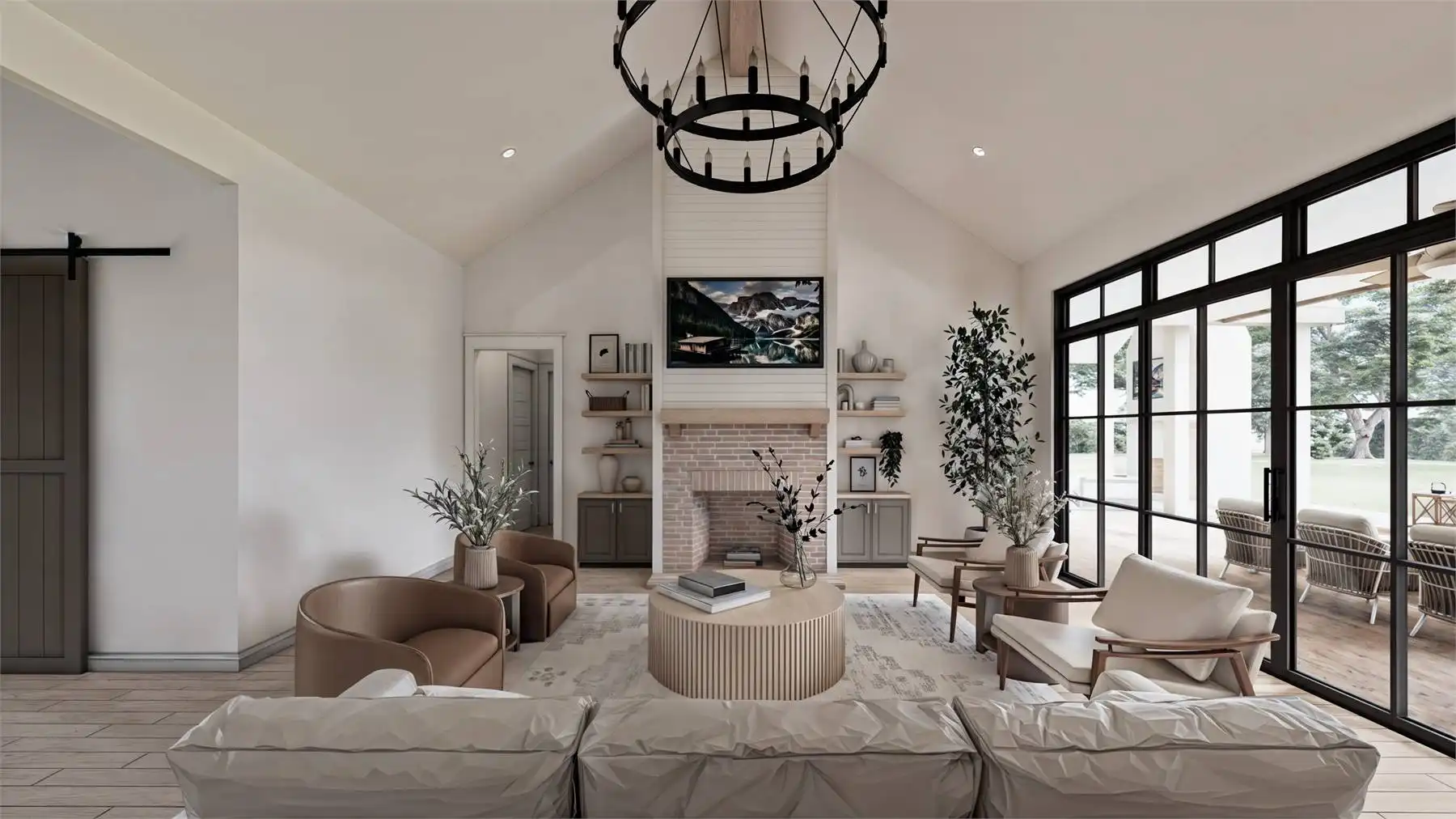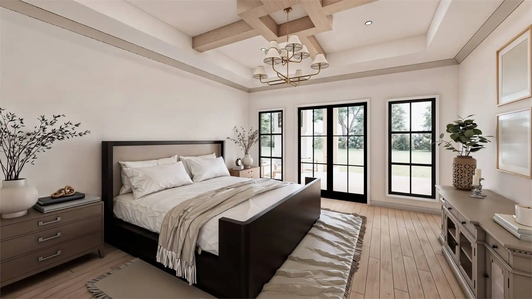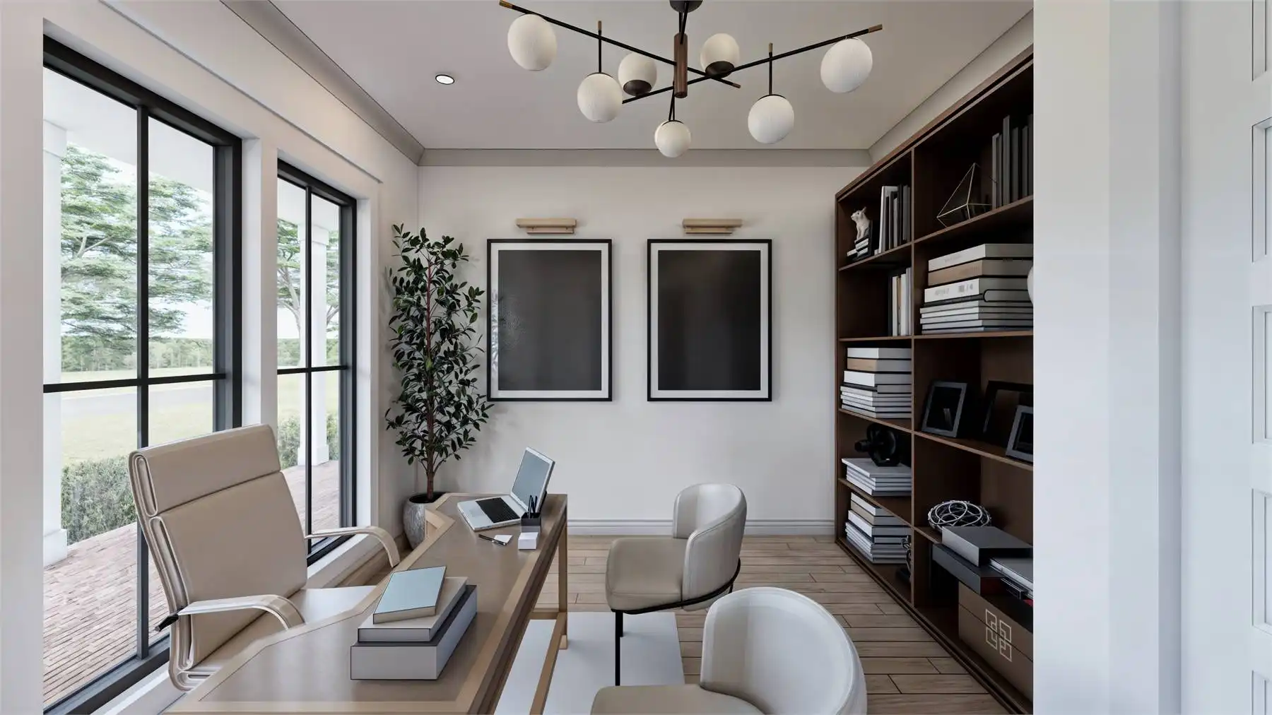 House Plan 9752 is a beautiful one-story Modern Farmhouse offering 3,292 square feet of living space, with 4 bedrooms, 3.5 bathrooms, and a home office. The exterior features exposed rafter tails, a metal roof, stone accents, and board and batten siding for a timeless look. Inside, the open layout is perfect for family living, and the optional bonus room offers extra space with the potential for an additional half bath.