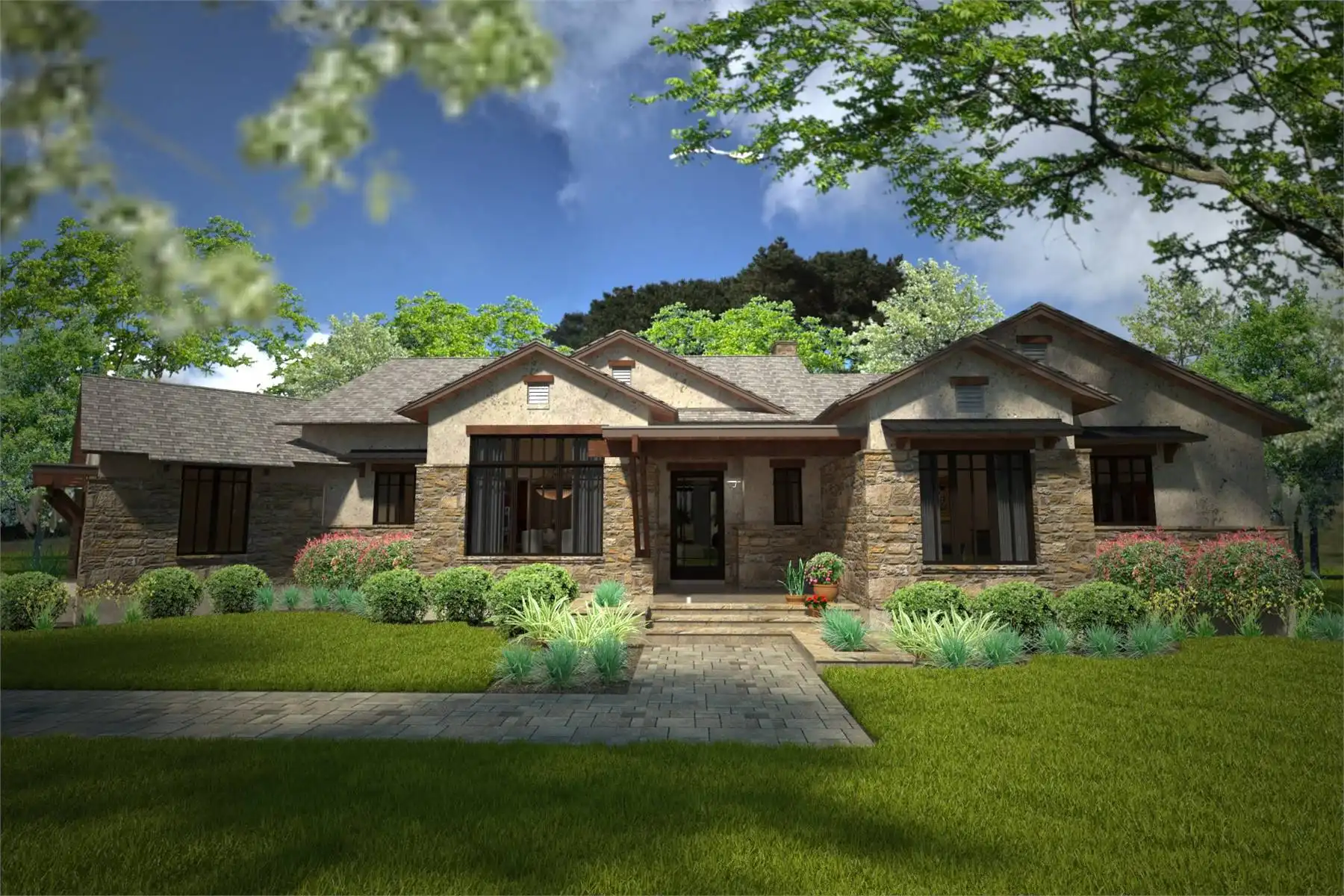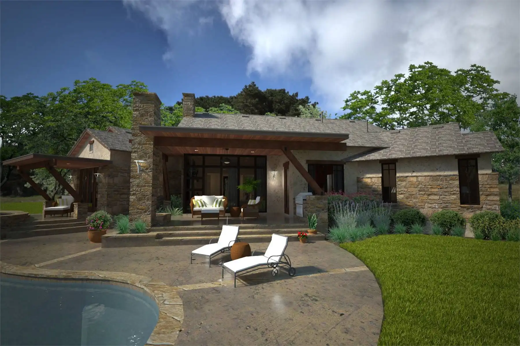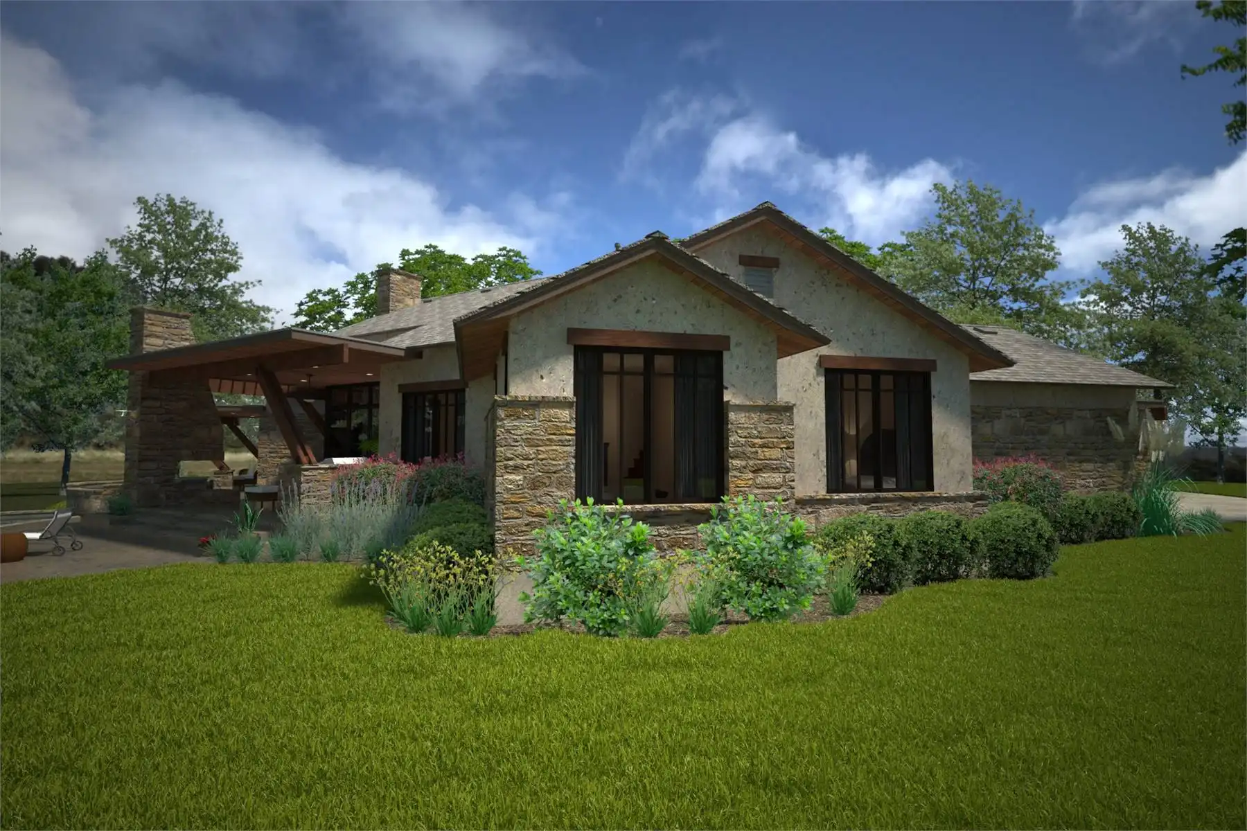 A wide open family/kitchen is bounded by a large corner window which is 10' tall and all the way to the floor. This provides a wide open view of your outdoor living areas or any scenic views that are available. Secondary bedroom are conveniently separated to the back and rear with a desk and a access to a bonus/playroom. The stairs also lead to a basement from the utility room side. A large island kitchen has easy access to the dining, a walk in pantry and nearby utility area as well as the garage. The study doubles as a guest room and has a convenient powder bath adjacent to it. The master suite is strategically angled to provide separation from the family areas and add interest and a slightly more private covered patio. Angled double cedar beams frame the wide open view on the lanai bordered by a three sided fireplace that seems to defy gravity. Plenty of room for grilling and lots of niches to landscape in including a trellis to accent the corner view from the family. The master bath boasts a large walk in closet, corner tub with large view windows and a walk-in shower. Clean lines and warm materials make this an exciting new design that's not only attractive by perfect for small families and empty-nesters. Low pitches make this home more affordable and cost effective to maintain.