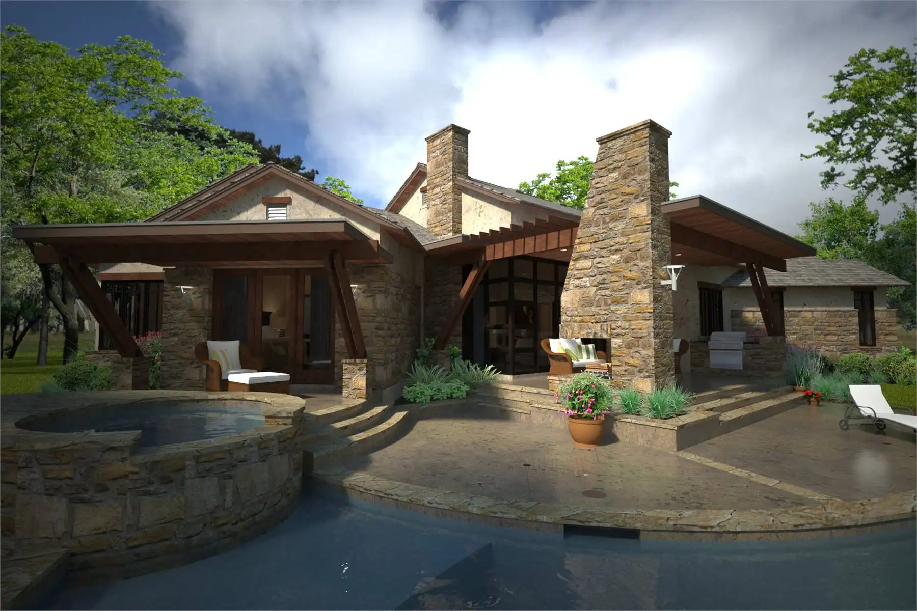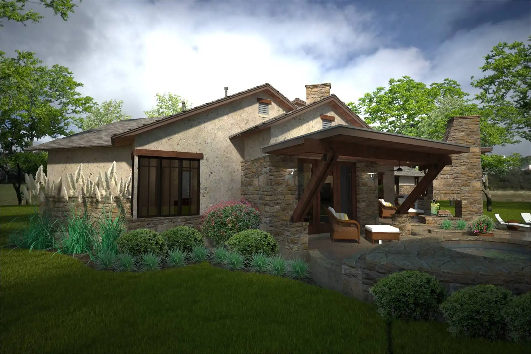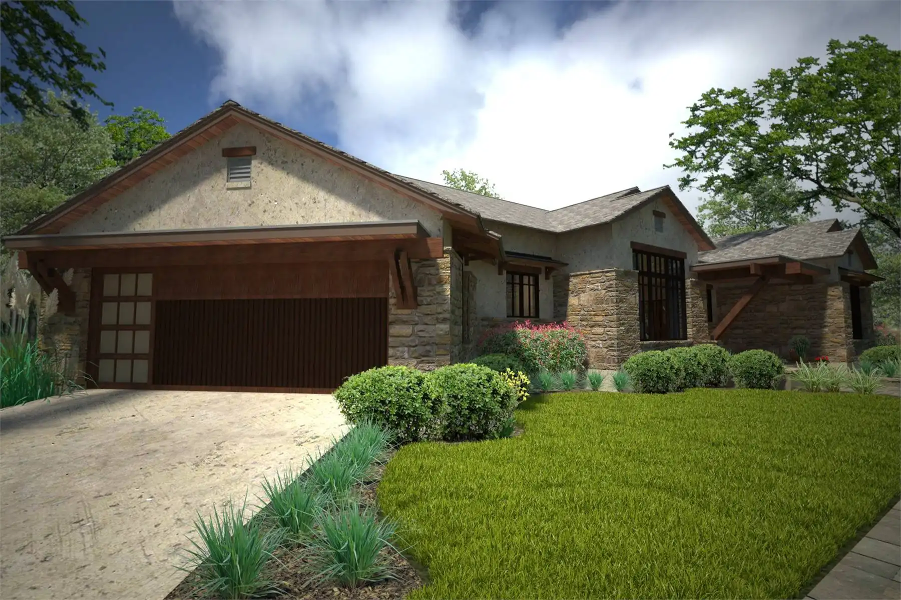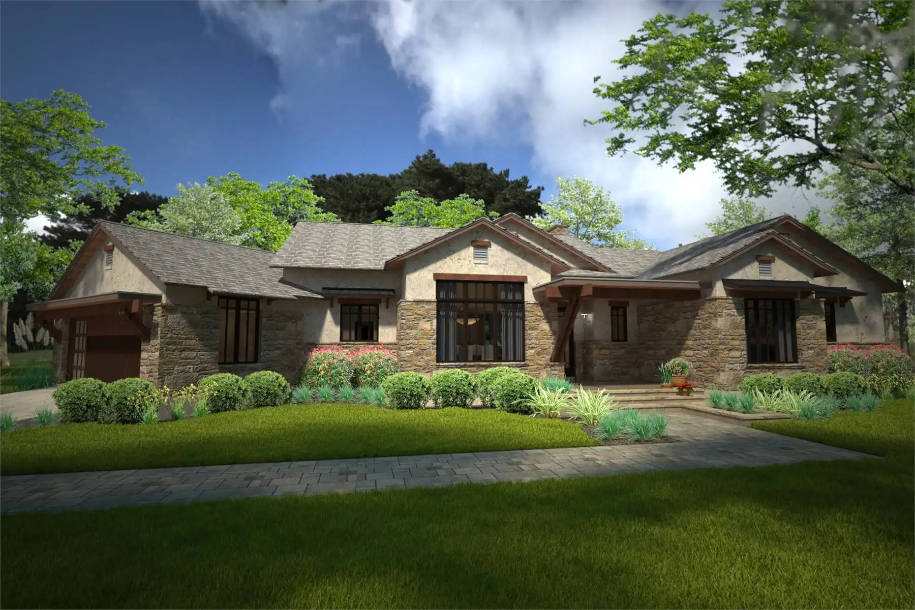 A wide open family/kitchen is bounded by a large corner window which is 10' tall and all the way to the floor. This provides a wide open view of your outdoor living areas or any scenic views that are available. Secondary bedroom are conveniently separated to the back and rear with a desk and a access to a bonus/playroom. The stairs also lead to a basement from the utility room side. A large island kitchen has easy access to the dining, a walk in pantry and nearby utility area as well as the garage. The study doubles as a guest room and has a convenient powder bath adjacent to it. The master suite is strategically angled to provide separation from the family areas and add interest and a slightly more private covered patio. Angled double cedar beams frame the wide open view on the lanai bordered by a three sided fireplace that seems to defy gravity. Plenty of room for grilling and lots of niches to landscape in including a trellis to accent the corner view from the family. The master bath boasts a large walk in closet, corner tub with large view windows and a walk-in shower. Clean lines and warm materials make this an exciting new design that's not only attractive by perfect for small families and empty-nesters. Low pitches make this home more affordable and cost effective to maintain.