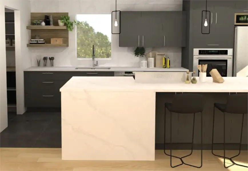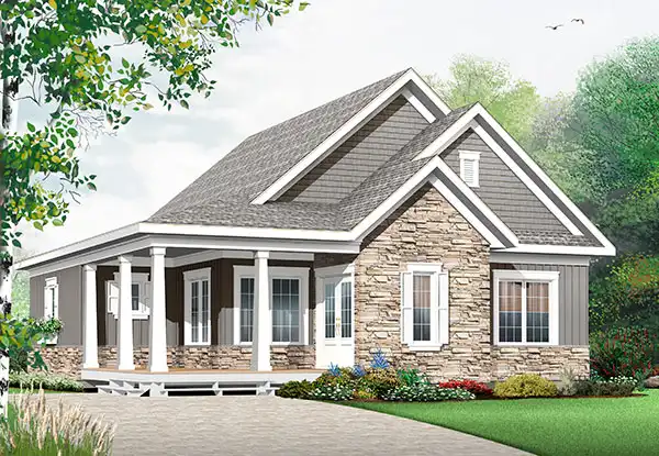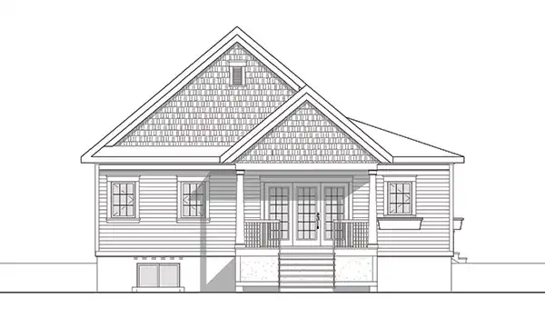 You're sure to get compliments from passersby when you build this four-bedroom bungalow design. Off the porch, French doors welcome guests into the foyer and the delightful living room. The island kitchen boasts an oversized pantry. The dining room opens to a breezy deck. The master bedroom and a study/bedroom share a compartmentalized bath. Downstairs, two more bedrooms share another split bath.