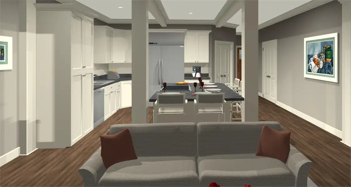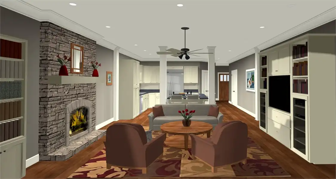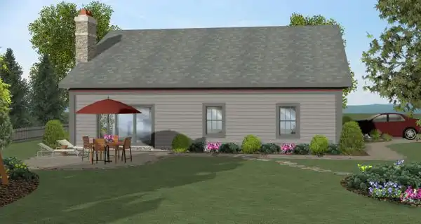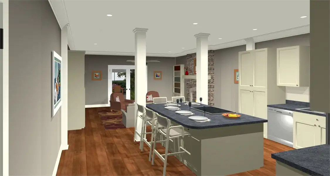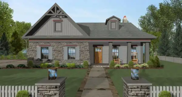 Striking columns and a front porch enhance the façade of this affordable country house plan, with four bedrooms, two baths and 1,499 square feet of living space. A fireplace warms the open family room, and French doors in this home plan open to a breezy patio. The eat-in kitchen provides seating for five. Relax in the deluxe master bedroom, with its handy walk-in closet. The personal bath flaunts a separate tub and shower, plus a single sink. Two secondary bedrooms share a hall bath in this home design. Builders point out the versatility of the fourth bedroom; it could be used as a formal dining room or a home office.