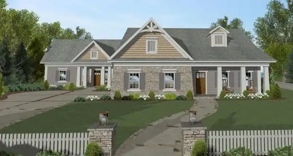 Shuttered windows lend a nostalgic feel to this affordable cottage house plan, with one story, four bedrooms, two baths and 1,671 square feet of living space. With 514 square feet, a separate guest nest provides accommodations for visitors or in-laws. Entertain friends in the family room of this home plan, where a fireplace adds ambience. Step out to the backyard porch for a breath of fresh air. Five seats make up the snack area in the eat-in kitchen. The quiet master bedroom flaunts his-and-hers walk-in closets. The personal bath is anchored by a whirlpool tub, and includes a separate shower and a dual-sink vanity. Our customers love the front bedroom of this home design, which could serve as a dining room or a home office. Don't overlook the front porch, and of course the guest nest.