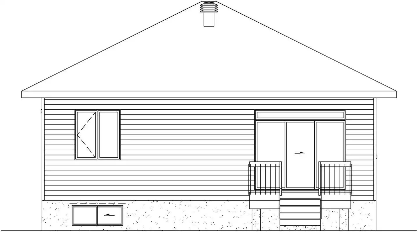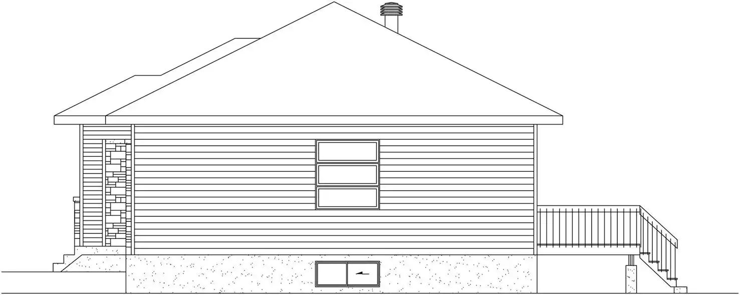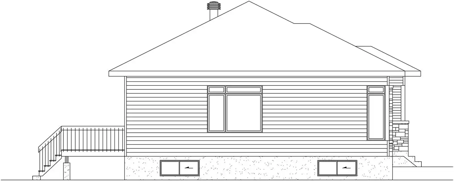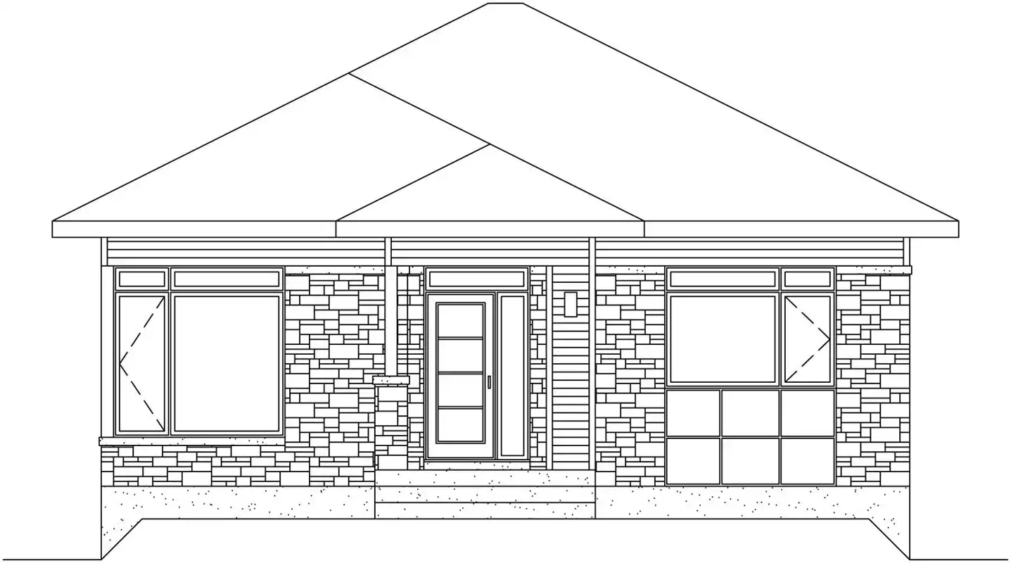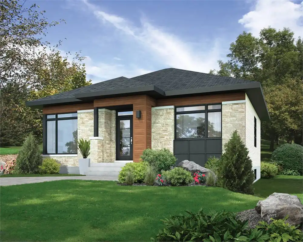 Prominent windows and stone accents enhance this contemporary one-story home design. Meet your guests at the front door and usher them into the lovely living room for relaxing conversation. The open kitchen showcases an island snack bar for three. You'll appreciate the nearby laundry room. A sizable bath with a garden tub is shared by two corner bedrooms. Remember that the basement level can double your square footage. The narrow width makes this home design suitable for just about any lot.