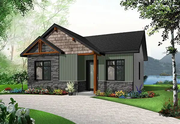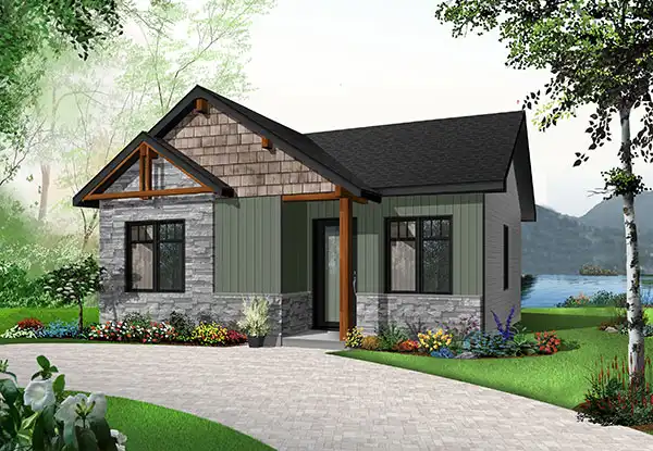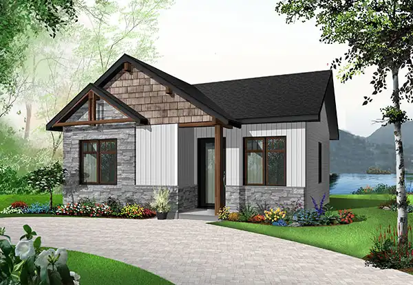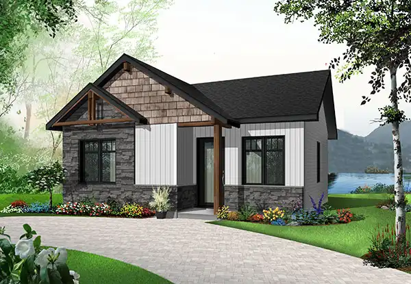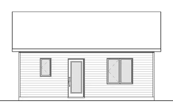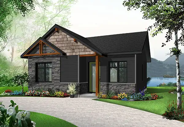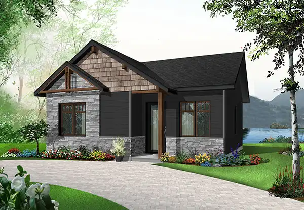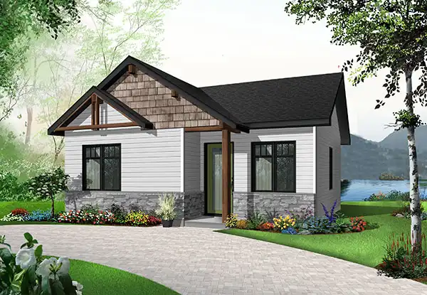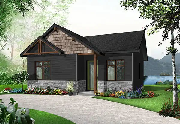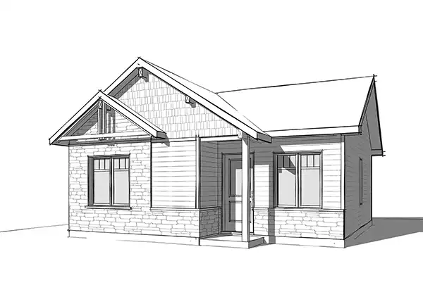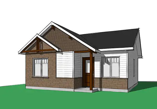 This cute two-bedroom design shows off a modern exterior. Show your guests into the friendly family room, where good conversation will be enjoyed. The wide-open kitchen has enough space for a table and four chairs. Note the handy door to the backyard. The two bedrooms are shown with Ikea PAX wardrobes and share a full bath that includes a garden tub. Note the stacked washer/dryer in the bath.