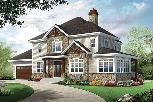 A cute front porch and rustic stone accents lend a country feel to this five-bedroom home design. Inside, the great room is bright and cheery, promoting pleasant conversation. A two-sided fireplace defines the versatile dining room, which opens to a breezy porch. The gourmet kitchen incorporates an island snack space for four. A quiet home office could serve as a guest room; note the direct access to a full bath. Upstairs, the master bedroom offers French doors to a private outdoor balcony. You'll appreciate the walk-in closet and the personal bath. Three secondary bedrooms and two more baths round out the upper level.