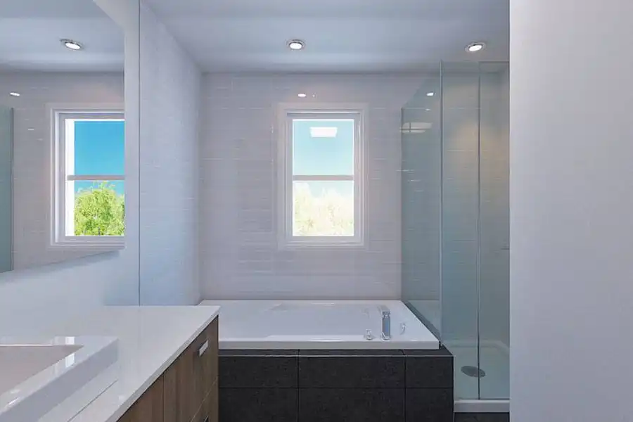 An attractive façade is sure to draw compliments for this contemporary house plan, with four bedrooms, 2.5 baths and 2,135 square feet of living space. A two-way fireplace defines the great room and dining room in this home plan, for fantastic entertaining. The wide-open kitchen boasts island snack space for three. The nearby laundry room is unusually large. Sliding glass doors allow you to step outside for dessert and stargazing. On the second level, the posh master bedroom boasts an interesting walk-through closet. In the private bath, you'll find a garden tub, an oversized shower and two sinks. A hall bath with two sinks serves three secondary bedrooms. Builders point out the air-lock entry at the front door of this home design, minimizing heat loss in winter months.
