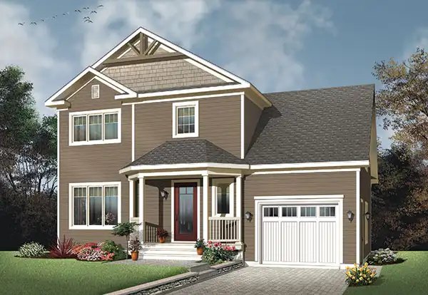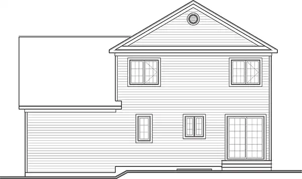 A cute front porch lends a country feel to this three-bedroom home design. Inside, the great room is perfect for good conversation. The open kitchen features an island snack bar for two. The versatile dining area opens to the backyard via sliding glass doors. Note the handy laundry facilities and powder room. On the upper level, the serene master suite is a peaceful haven at day's end. Two more bedrooms share a full bath.
