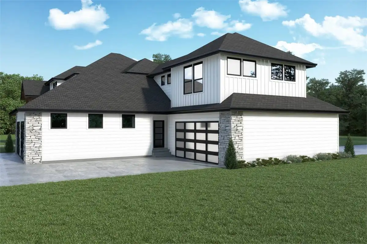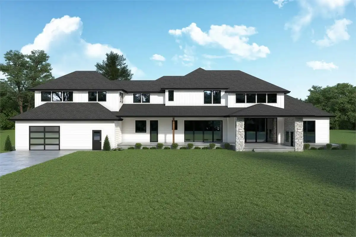 Welcome to 4,64 sf of contemporary luxury. Containing 5 bedrooms, 4 1/2 bathrooms and a 5 car garage, this gorgeous home is perfect for your growing family. The stunning exterior is a combination of contemporary and farmhouse styles featuring glass and stone as well as white siding which gives that fresh, clean look. Inside, as soon as you walk in the front door, you'll feel the large open spaces that are inviting and comfortable. The comfort begins with the vaulted front porch and foyer, an open staircase to the left and a beautiful great room with large fireplace. Large, folding glass doors leads to the covered patio which runs the entire width of the rear of the home helping to provide wonderful outdoor living, The chef-inspired kitchen begs you to come in and make gourmet meals for your family and friends. A huge laundry room, mud room, and 1/2 bath is just beyond the kitchen and are connected to the two garages through the mud room. The master bedroom with ensuite bath is on the right side of the home and features a dual sink vanity, walk in shower, private water closet and enormous walk in closet. The second level to the home is where you'll find 3 additional bedrooms and an office with conference room and bar for entertaining business clients. The basement plan includes an additional bedroom with full bath, a large media room with bar and the mechanical room. This home is amazing and terrific for your family. There is room to grow here and much to be enjoyed.I