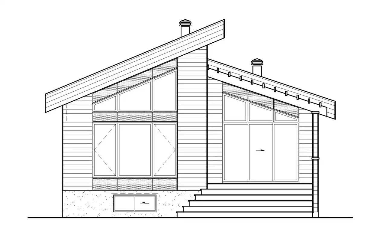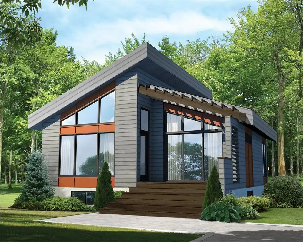 If you are looking for a modern, vacation dwelling, this may be the perfect plan for you. Featuring 815 sf of living space, this comfortable 1 bedroom, 1 bath home features amenities generally found in larger homes. The exterior of the home is modern with large windows letting the outside in. The home contains an open living area with see-thru fireplace and the windows make the home feel larger than it actually is. The kitchen includes an island with a sink and is a great spot for quick meals. A small laundry room is just off the kitchen. The bathroom is accessible either through the kitchen, or a walk through the bedroom closet allowing access from either area. The bathroom is full size and features both a shower and tub. The bedroom is a nice size, with a see-through fireplace to the living room.
