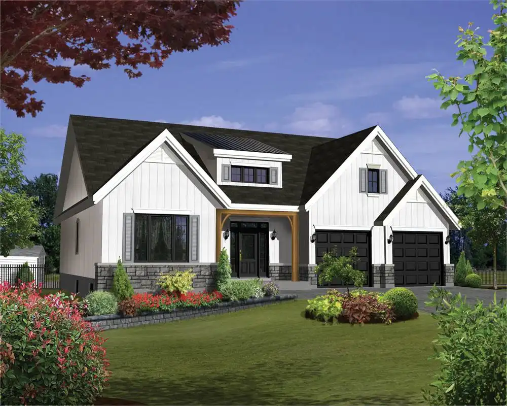 This home is ideal for those downsizing or for a young couple or even an individual wanting to finally build his or her first home. The curb appeal of the large shed dormer also functions by bringing light into the home. Privacy has been considered with a clever use of hallways for this 2 bed and 1.5 bath layout. The full bath knocks it out of the park with not only double sinks but a shower and a stand alone tub. The prominent sliding glass doors bring the outside in creating a perfect use of the porch for al fresco dining and socializing. The home is completed with a 2 car garage and a conveniently located laundry room and powder bath for guests.