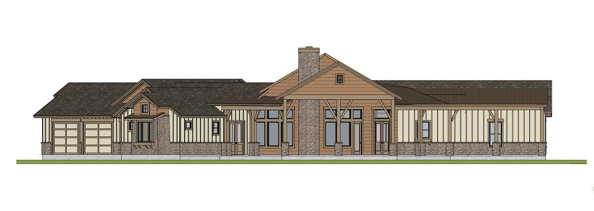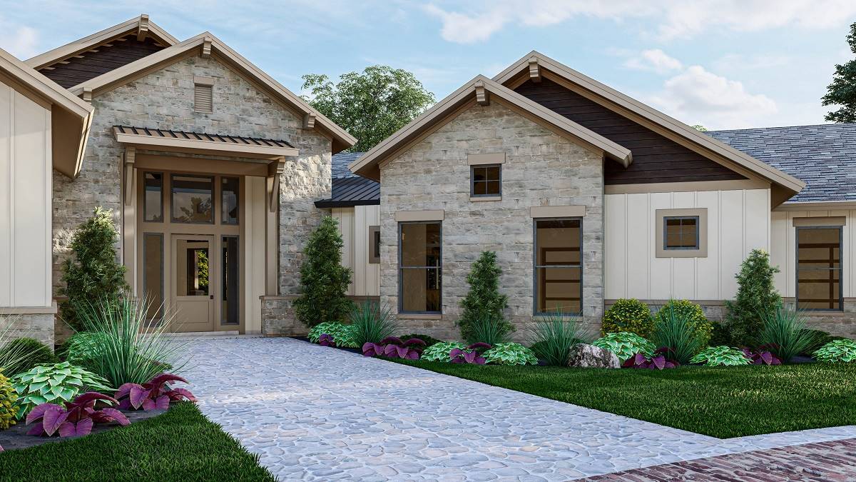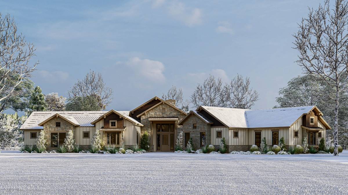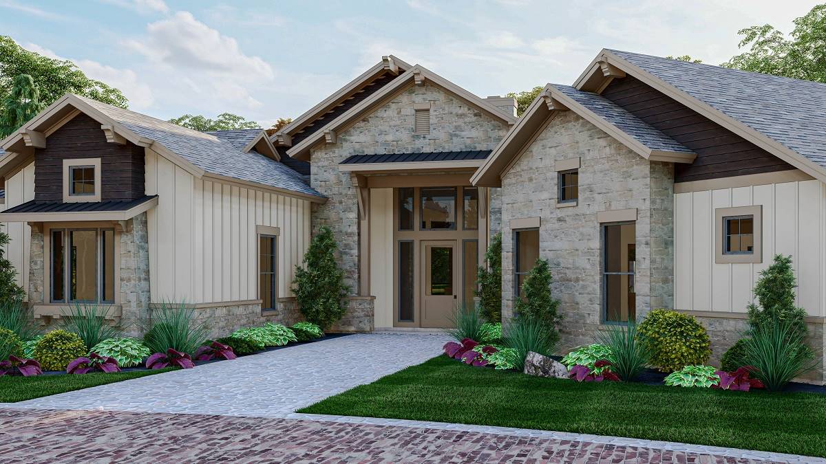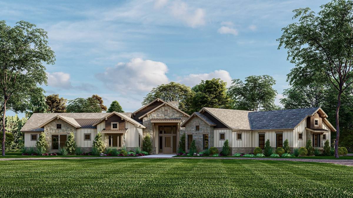 House Plan 9945 blends modern farmhouse charm with a refined single-story layout built for both function and luxury. The foyer leads into a grand great room with a high 14’ ceiling and direct views to the outdoor living porch. The kitchen features an oversized island and walk-in pantry, while the dining room sits conveniently nearby for everyday meals or hosting. The primary suite offers dual walk-in closets and a spa-style bath, while a second primary suite on the opposite side of the home creates ideal guest or multi-gen accommodations. Two additional bedrooms share a well-designed bath hallway for privacy and comfort. A study near the entry provides a quiet workspace. Outside, the covered outdoor living area includes a grilling kitchen, perfect for gathering, relaxing, or dining outdoors. Completing the layout is a spacious 3-car side-entry garage with drop zone access.