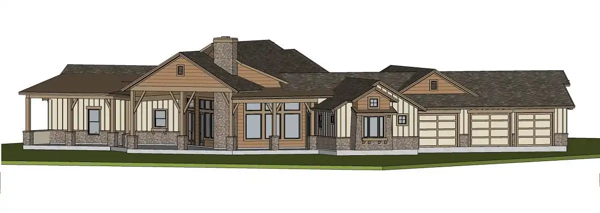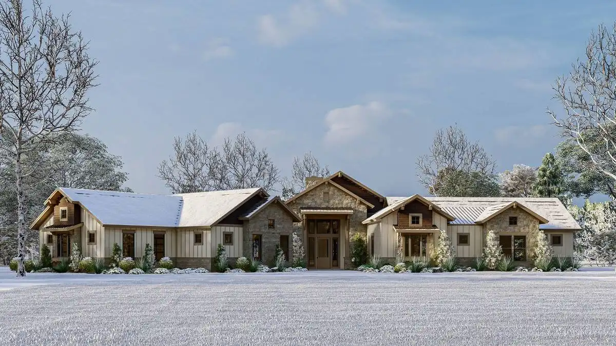 House Plan 9945 blends modern farmhouse charm with a refined single-story layout built for both function and luxury. The foyer leads into a grand great room with a high 14’ ceiling and direct views to the outdoor living porch. The kitchen features an oversized island and walk-in pantry, while the dining room sits conveniently nearby for everyday meals or hosting. The primary suite offers dual walk-in closets and a spa-style bath, while a second primary suite on the opposite side of the home creates ideal guest or multi-gen accommodations. Two additional bedrooms share a well-designed bath hallway for privacy and comfort. A study near the entry provides a quiet workspace. Outside, the covered outdoor living area includes a grilling kitchen, perfect for gathering, relaxing, or dining outdoors. Completing the layout is a spacious 3-car side-entry garage with drop zone access.