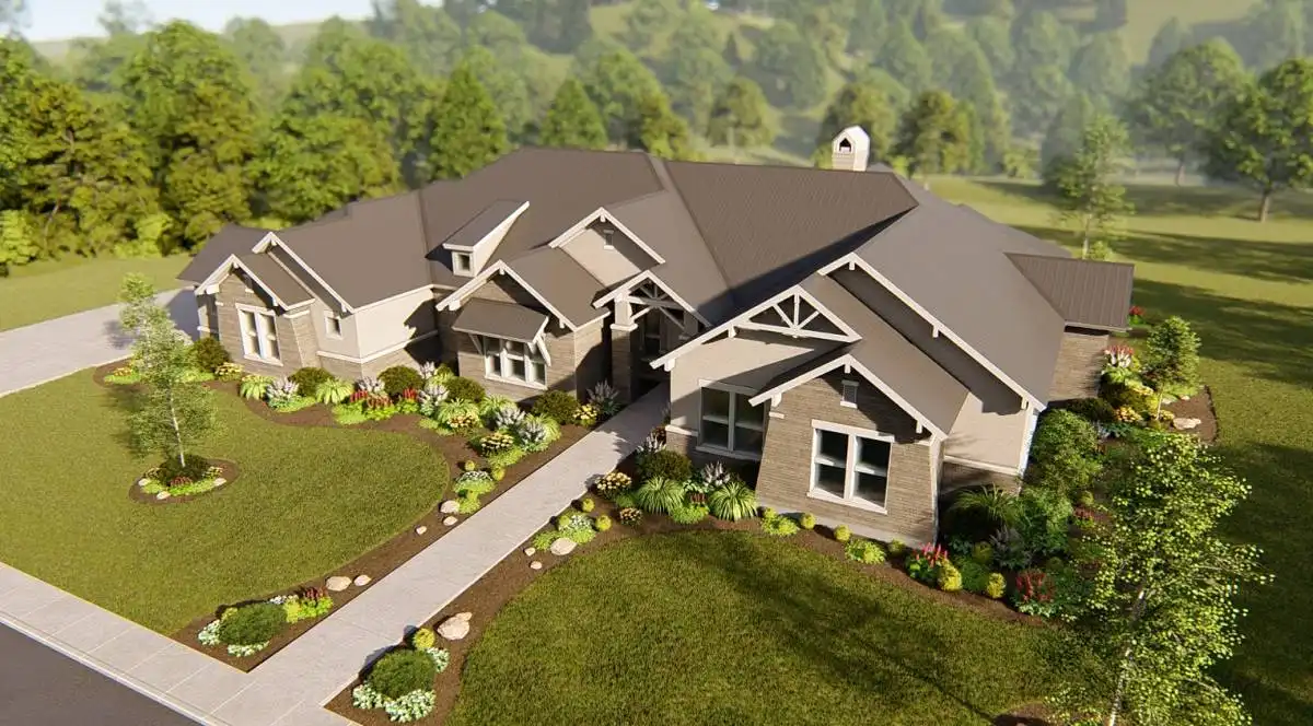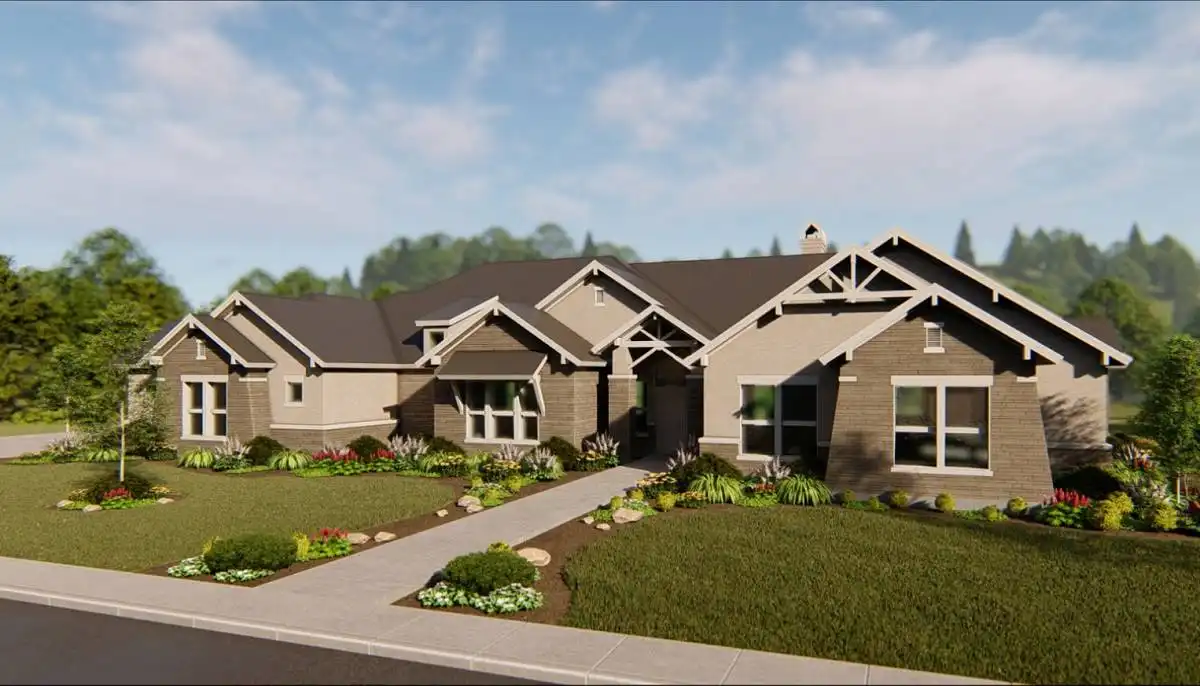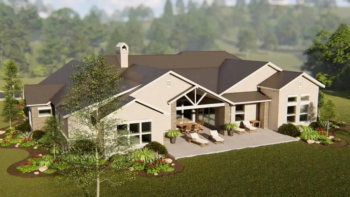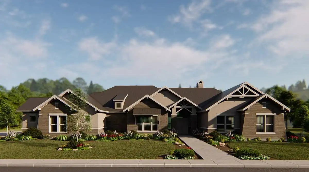 House Plan 9947 combines luxury ranch styling with a highly functional and comfortable floor plan layout. The heart of the home is the vaulted great room, which flows directly to the covered outdoor living space, creating strong indoor-outdoor connectivity. The kitchen includes a large island, walk-in pantry, and nearby casual dining space for easy daily living. The primary suite includes dual walk-in closets, a spacious bath layout, and tray ceiling detailing. A separate guest suite with its own bath and porch access enhances privacy and flexibility. The game room provides an additional entertainment zone, while the study supports work-from-home needs. Dual garages—one 2-car and one 1-car—support storage, vehicles, or workshop space.