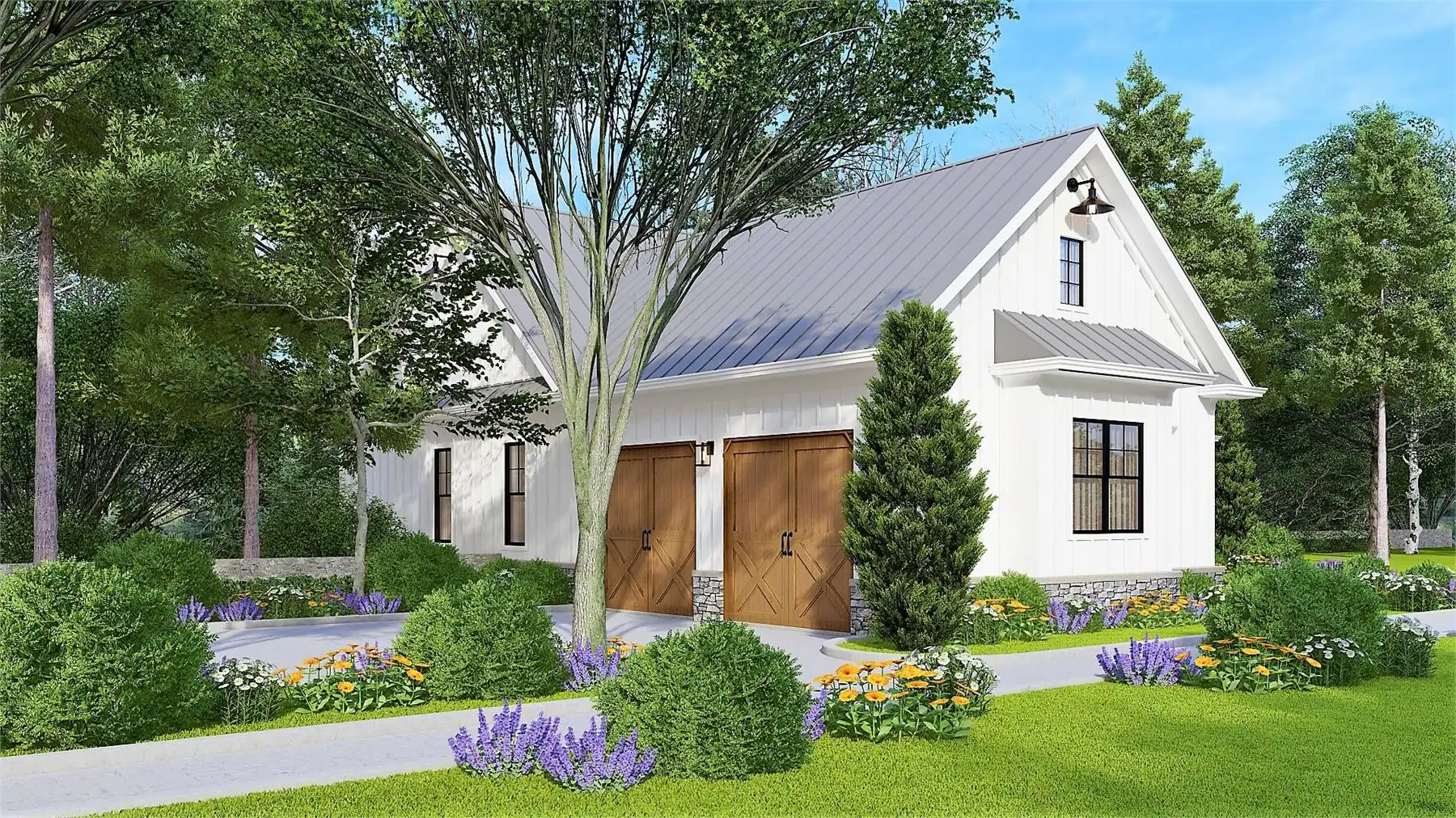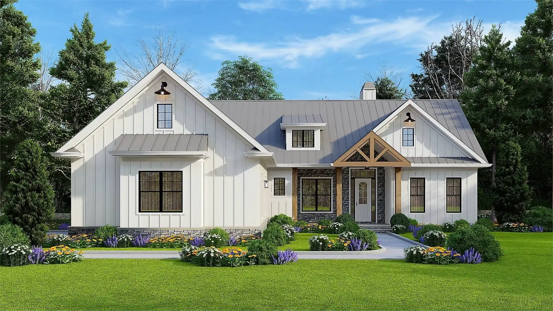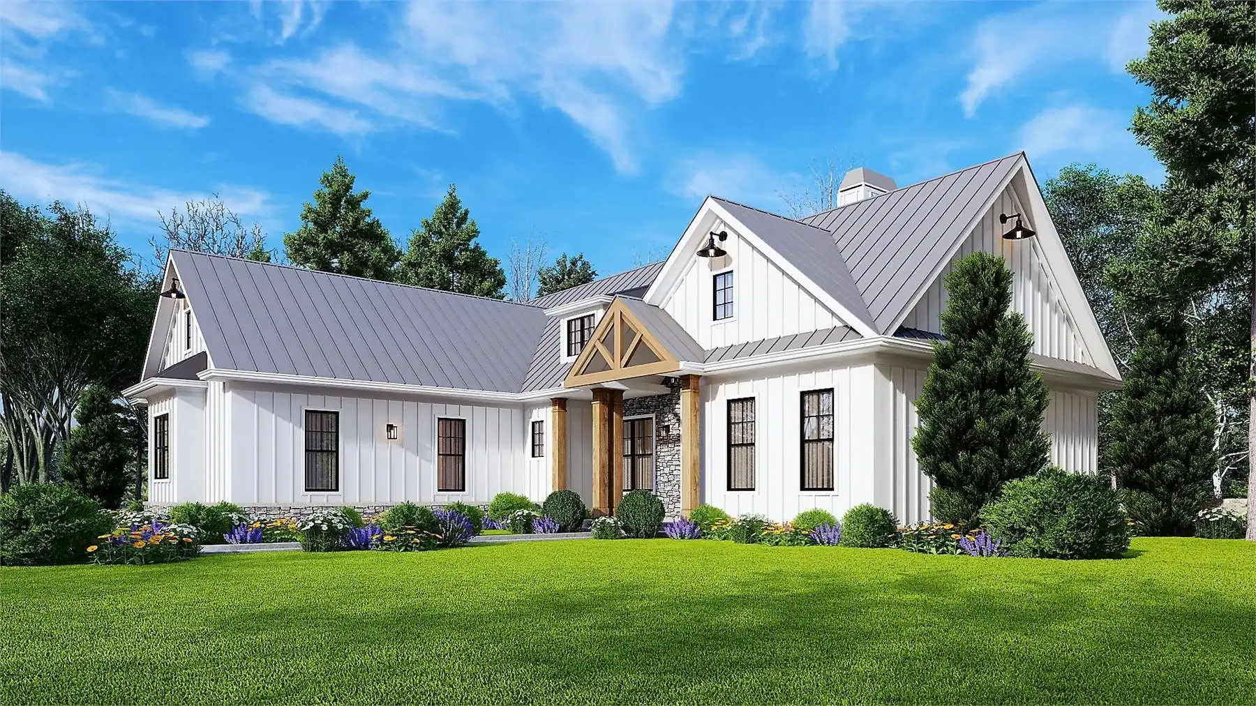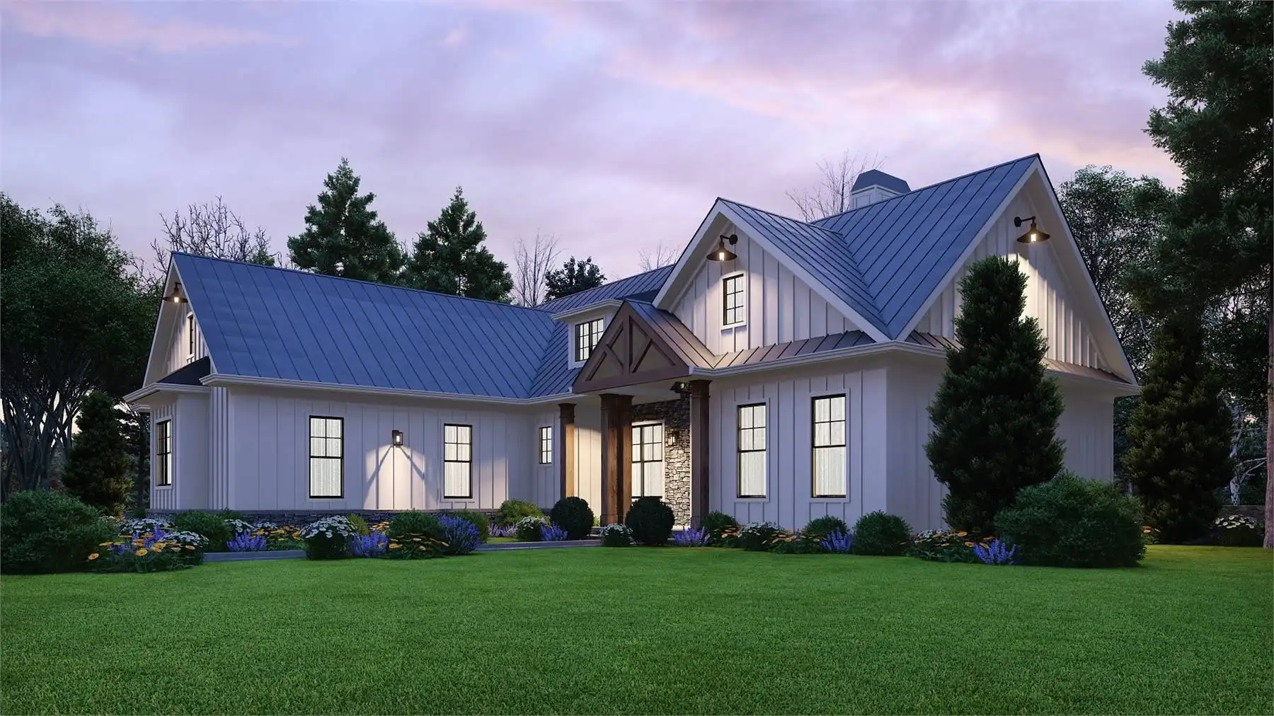 House Plan 9950 delivers classic farmhouse character with a modern edge, highlighted by board and batten siding, a ribbed metal roof, and a welcoming shed dormer. At the center of the home, an open concept layout brings together the lodge room, kitchen, and dining area, creating a warm and inviting space for daily life. A striking fireplace defines the lodge room, while sliding doors lead out to a vaulted covered porch, extending the living space outdoors. The primary suite is tucked away on one side of the home for added privacy and includes a four fixture bathroom and a walk in closet with natural light. Two additional bedrooms are aligned near the double garage and share a full bathroom, offering a practical and family friendly arrangement. The finished lower level adds 1,042 square feet of versatile space, featuring a social room with a wet bar, room for games or gatherings, and two more bedrooms. An unfinished lawn and garden center provides valuable storage and workspace, rounding out a design that balances comfort, function, and farmhouse appeal.