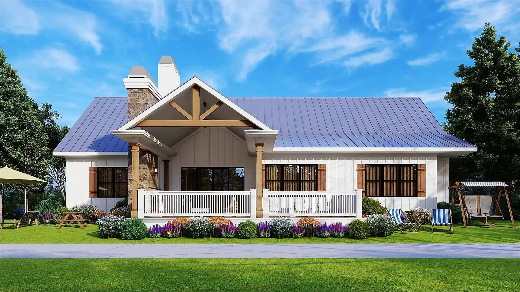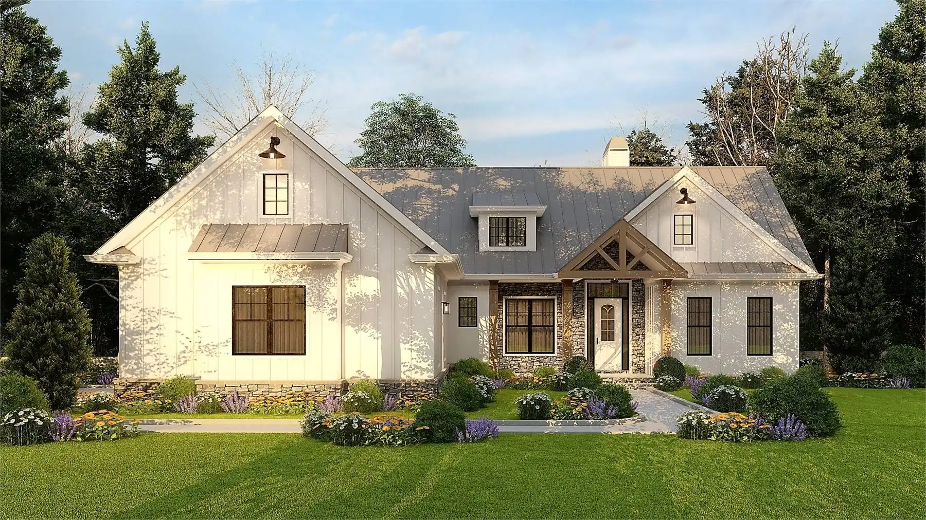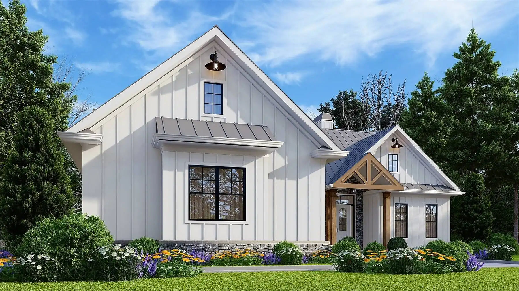 House Plan 9950 delivers classic farmhouse character with a modern edge, highlighted by board and batten siding, a ribbed metal roof, and a welcoming shed dormer. At the center of the home, an open concept layout brings together the lodge room, kitchen, and dining area, creating a warm and inviting space for daily life. A striking fireplace defines the lodge room, while sliding doors lead out to a vaulted covered porch, extending the living space outdoors. The primary suite is tucked away on one side of the home for added privacy and includes a four fixture bathroom and a walk in closet with natural light. Two additional bedrooms are aligned near the double garage and share a full bathroom, offering a practical and family friendly arrangement. The finished lower level adds 1,042 square feet of versatile space, featuring a social room with a wet bar, room for games or gatherings, and two more bedrooms. An unfinished lawn and garden center provides valuable storage and workspace, rounding out a design that balances comfort, function, and farmhouse appeal.