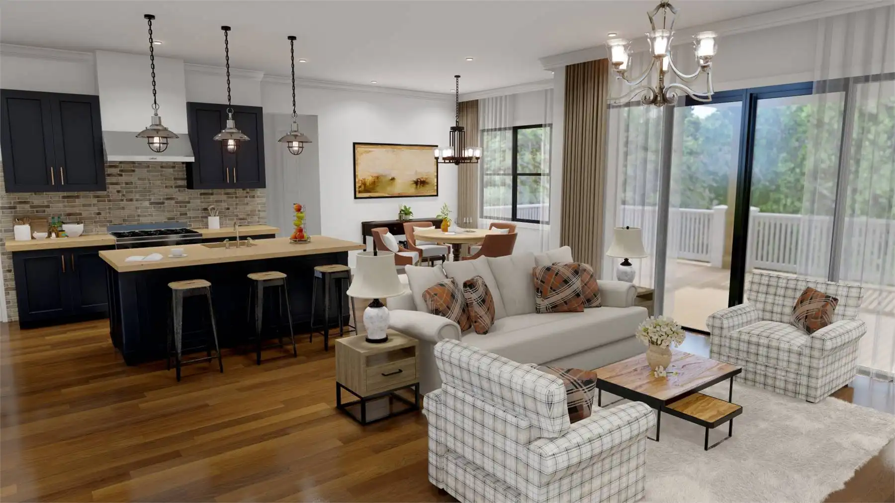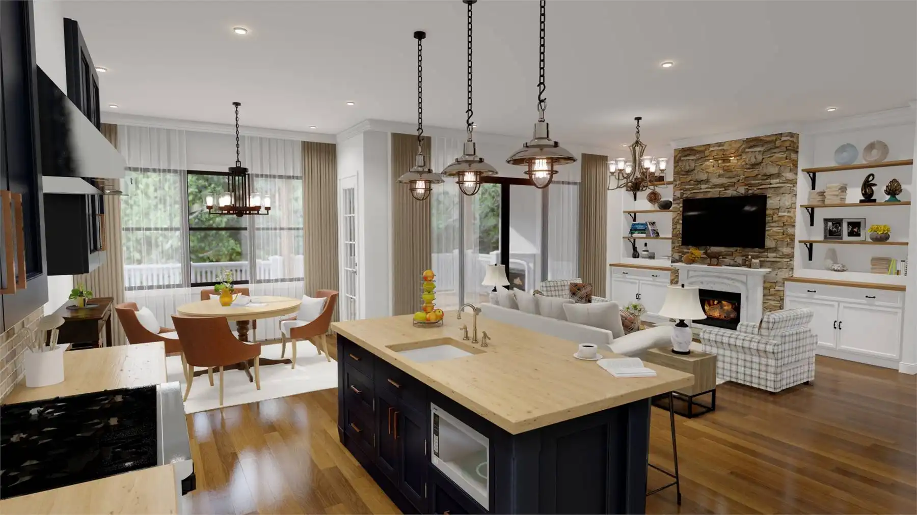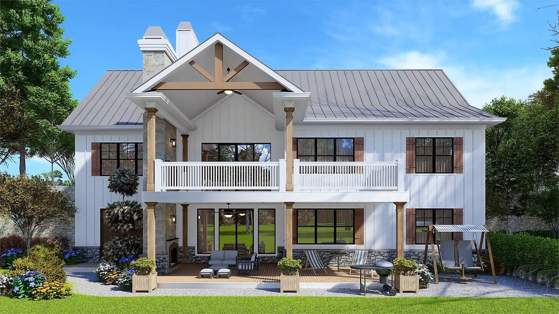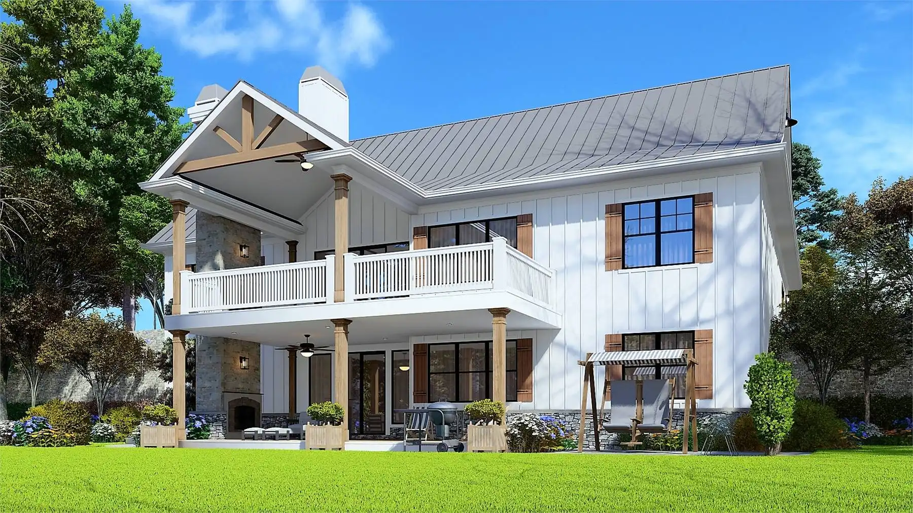 House Plan 9950 delivers classic farmhouse character with a modern edge, highlighted by board and batten siding, a ribbed metal roof, and a welcoming shed dormer. At the center of the home, an open concept layout brings together the lodge room, kitchen, and dining area, creating a warm and inviting space for daily life. A striking fireplace defines the lodge room, while sliding doors lead out to a vaulted covered porch, extending the living space outdoors. The primary suite is tucked away on one side of the home for added privacy and includes a four fixture bathroom and a walk in closet with natural light. Two additional bedrooms are aligned near the double garage and share a full bathroom, offering a practical and family friendly arrangement. The finished lower level adds 1,042 square feet of versatile space, featuring a social room with a wet bar, room for games or gatherings, and two more bedrooms. An unfinished lawn and garden center provides valuable storage and workspace, rounding out a design that balances comfort, function, and farmhouse appeal.