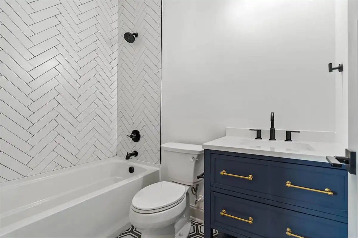 The master suite claims the entire right side of the home, front to back. The vaulted bedroom brings airiness and the sliding doors to the patio make those quiet nights of sharing a bottle of wine with your loved one even easier once the kiddos finally nod off.  The ensuite bathroom has a stand alone tub, a large 5’ x 4’ shower, and the walk-in closet even has a window for natural light and plenty of space to share.