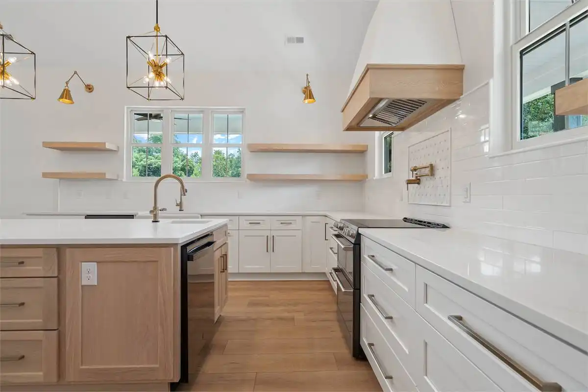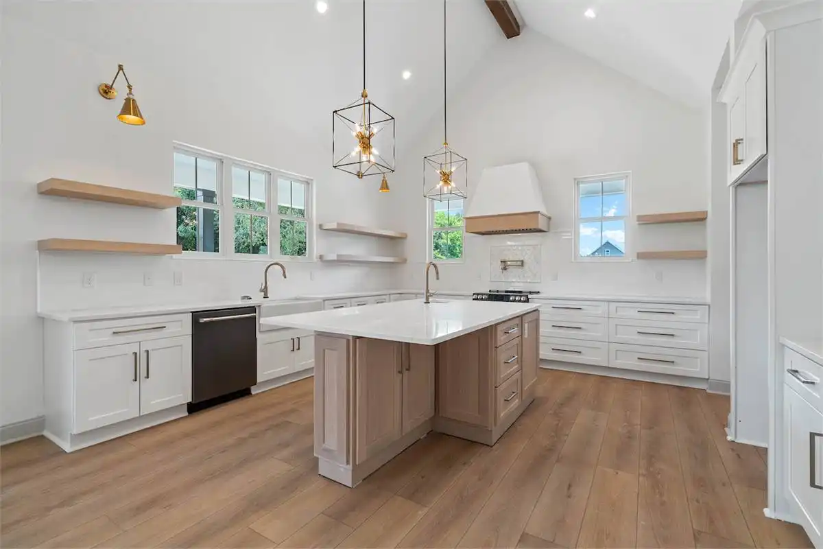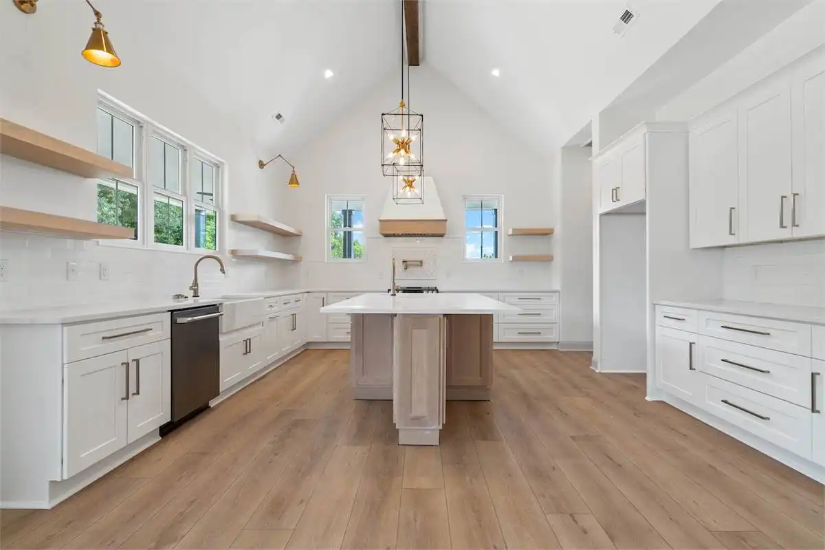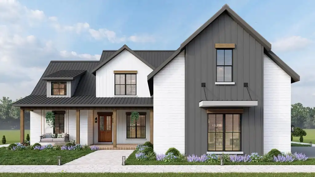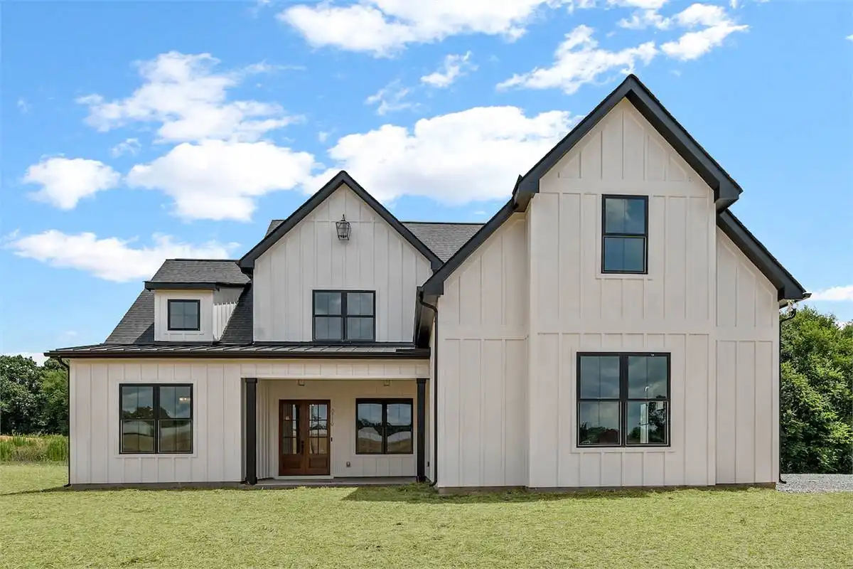 This two story Modern Farmhouse is an immediate show stopper with the first look at its mixed materials, the charming ribbed metal roof, and the quaint southern front porch. It couldn’t be more perfect for rocking chairs or a swing. Just don’t forget the iced sweet tea!