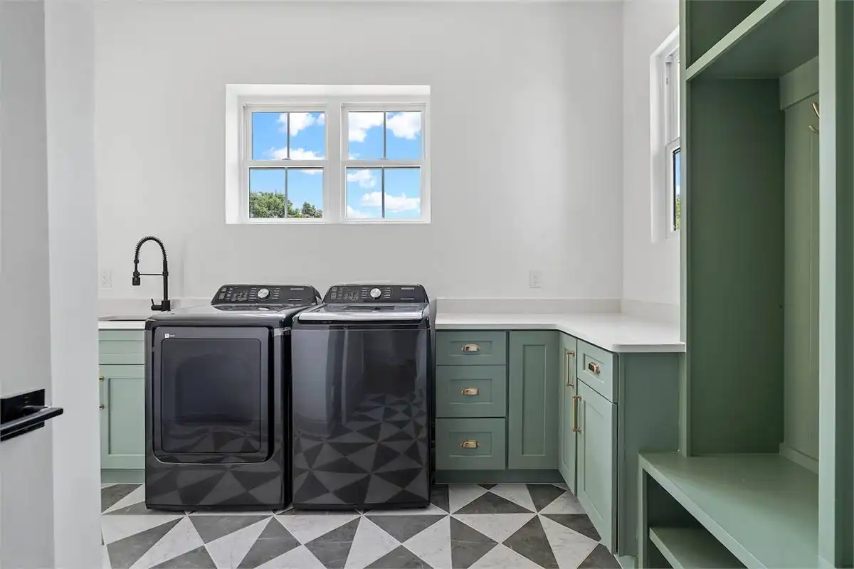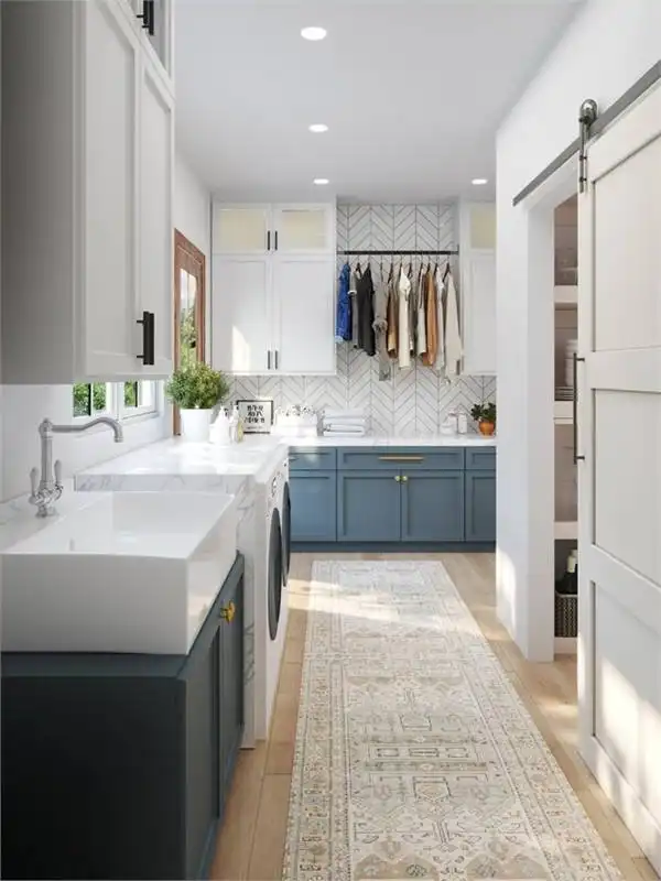 The spacious kitchen has a large island standing at 5'-6" x 7'-6". The laundry and utility area come off the 3 car side garage, which makes it convenient for grocery unloading and also helps to minimize clutter and messes. The powder bath of the home is thoughtfully tucked in behind the utility areas / by the stairwell for privacy for your guests. The pantry alone is a dream for any home chef.