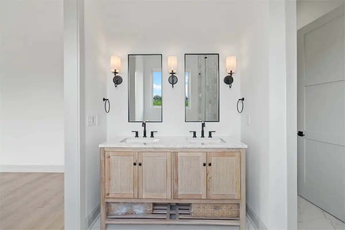 Up the stairs that are centralized off the main room you’ll find the two remaining secondary bedrooms, both with walk-in closets and access to the compartmentalized full hallway bath with dual vanities and a shower.
