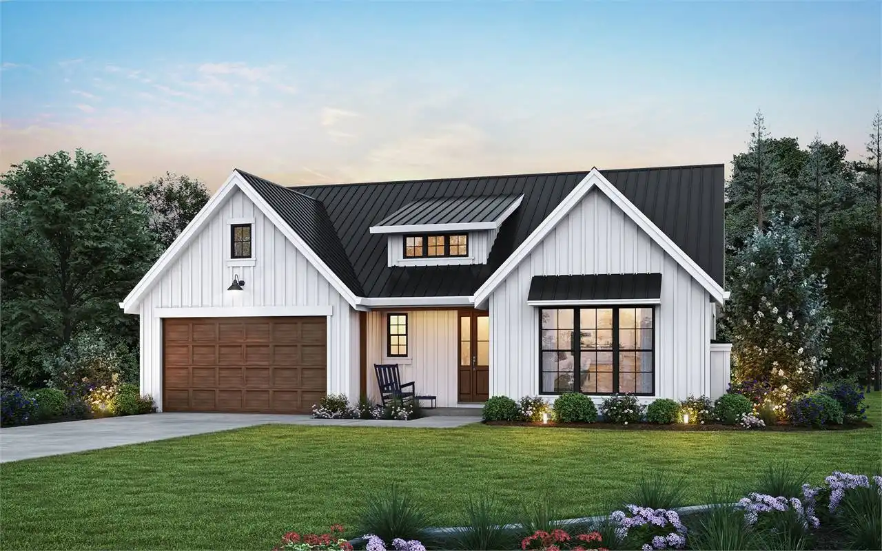 The curb appeal of this 1,959 square foot home is elevated with its ribbed metal roof, vertical siding, the large shed roof dormer window that brings in light and the wood paneled front 2 car garage.